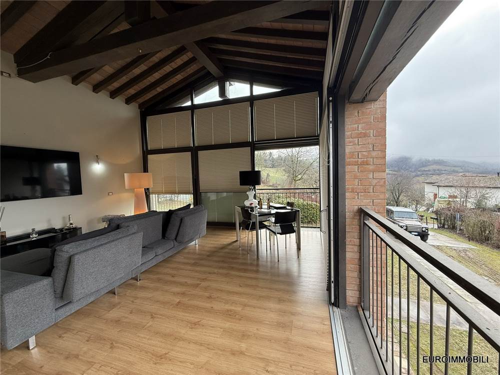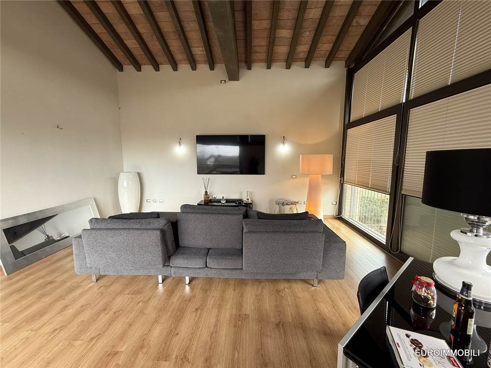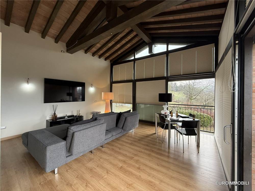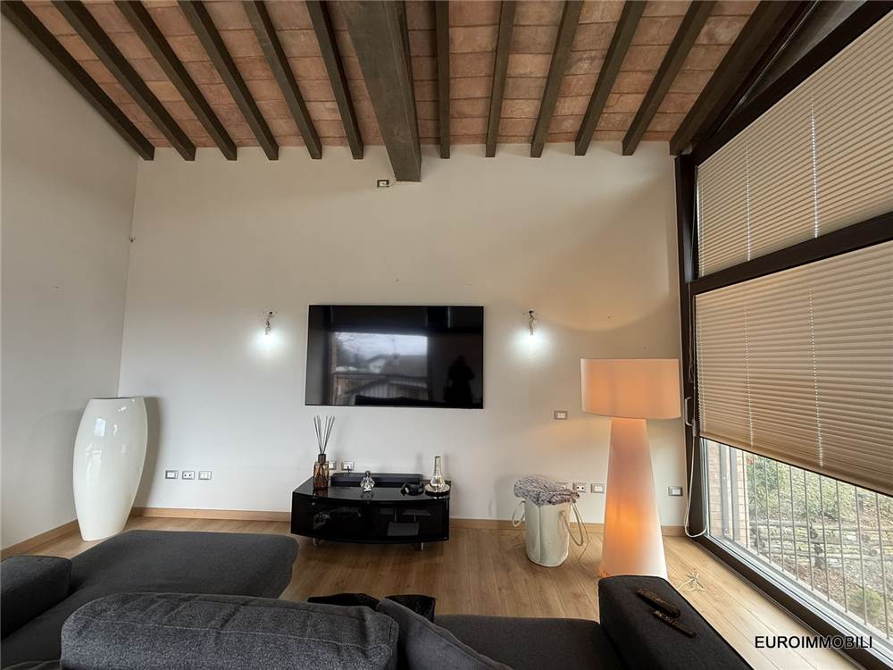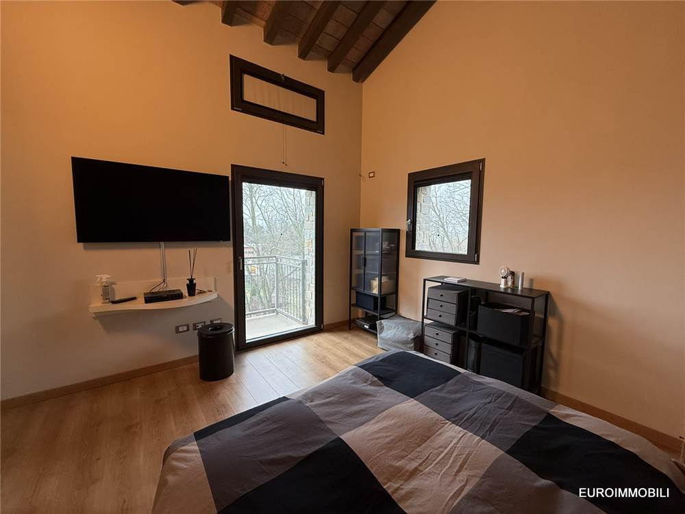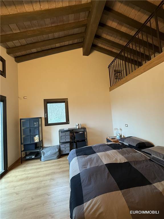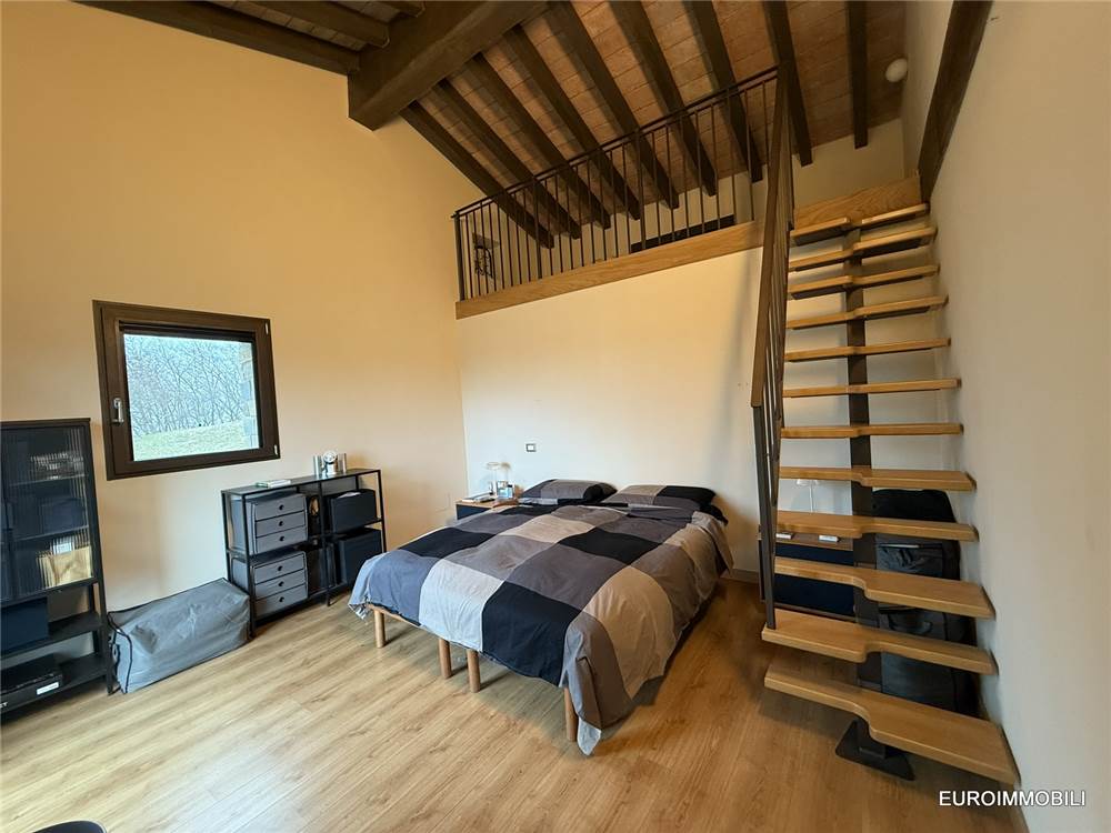 Il livello superiore ospita un suggestivo ambiente a tutta altezza, vero cuore scenografico della proprietà: le ampie vetrate con serramenti scorrevoli in metallo incorniciano il paesaggio e regalano straordinaria luminosità agli interni, creando una continuità naturale tra casa e panorama. Sempre su questo piano si trovano una seconda camera matrimoniale impreziosita da soppalco e un elegante bagno.