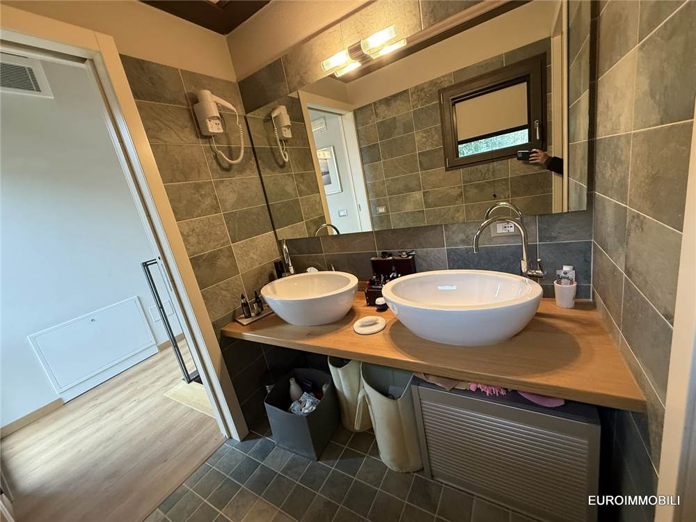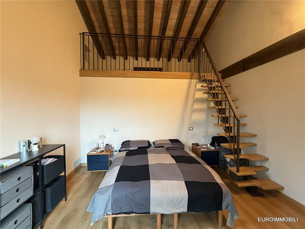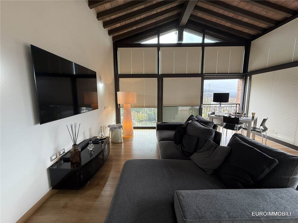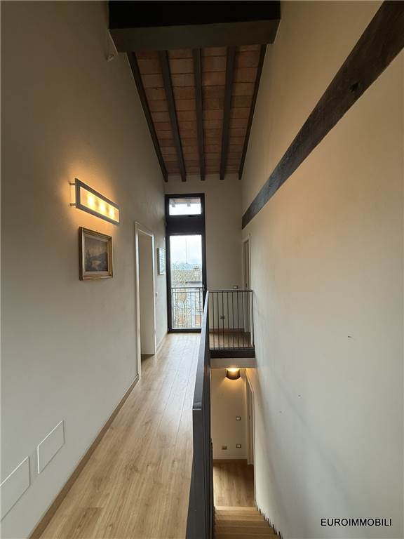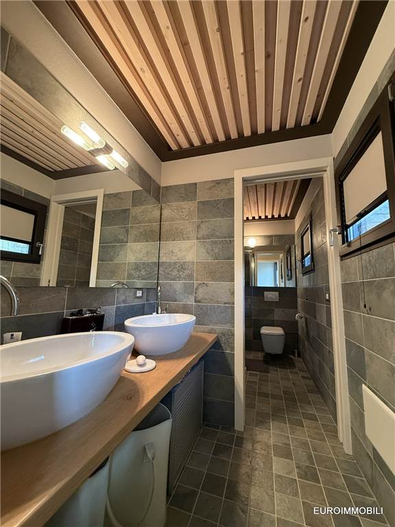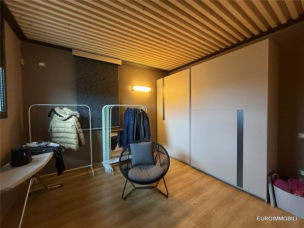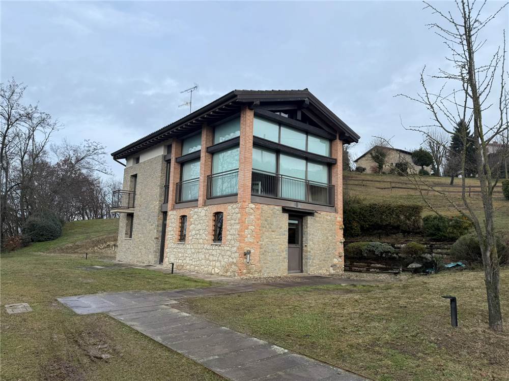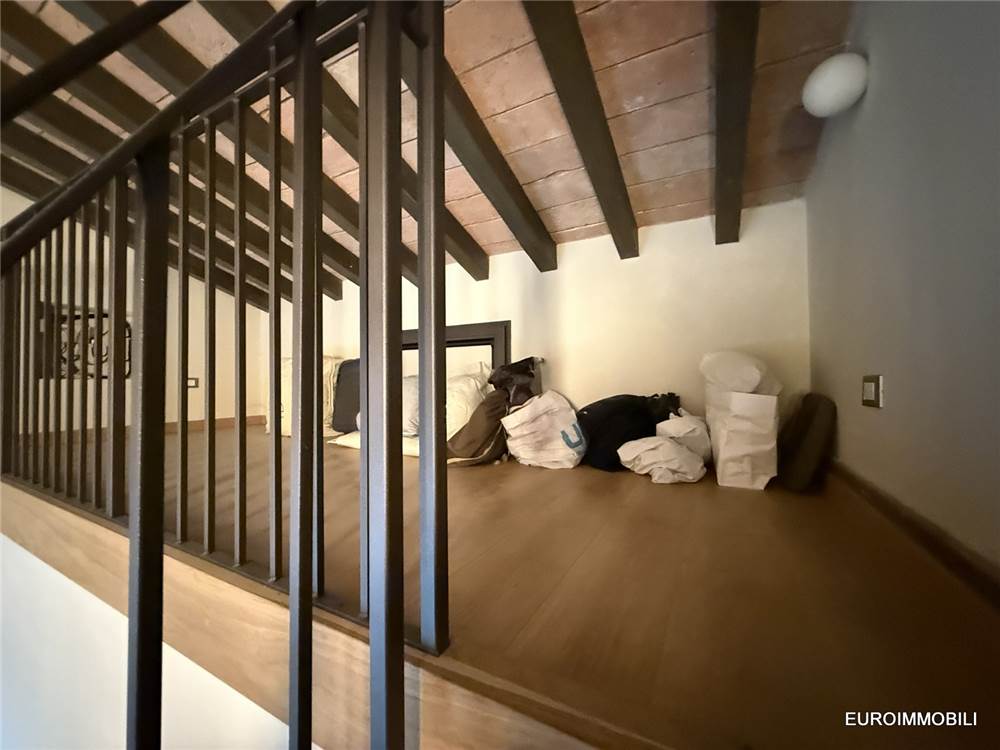 Il livello superiore ospita un suggestivo ambiente a tutta altezza, vero cuore scenografico della proprietà: le ampie vetrate con serramenti scorrevoli in metallo incorniciano il paesaggio e regalano straordinaria luminosità agli interni, creando una continuità naturale tra casa e panorama. Sempre su questo piano si trovano una seconda camera matrimoniale impreziosita da soppalco e un elegante bagno.