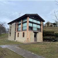 Il livello superiore ospita un suggestivo ambiente a tutta altezza, vero cuore scenografico della proprietà: le ampie vetrate con serramenti scorrevoli in metallo incorniciano il paesaggio e regalano straordinaria luminosità agli interni, creando una continuità naturale tra casa e panorama. Sempre su questo piano si trovano una seconda camera matrimoniale impreziosita da soppalco e un elegante bagno.