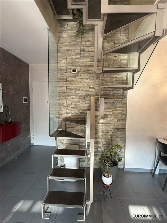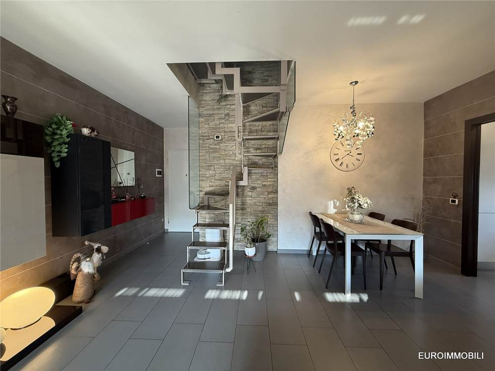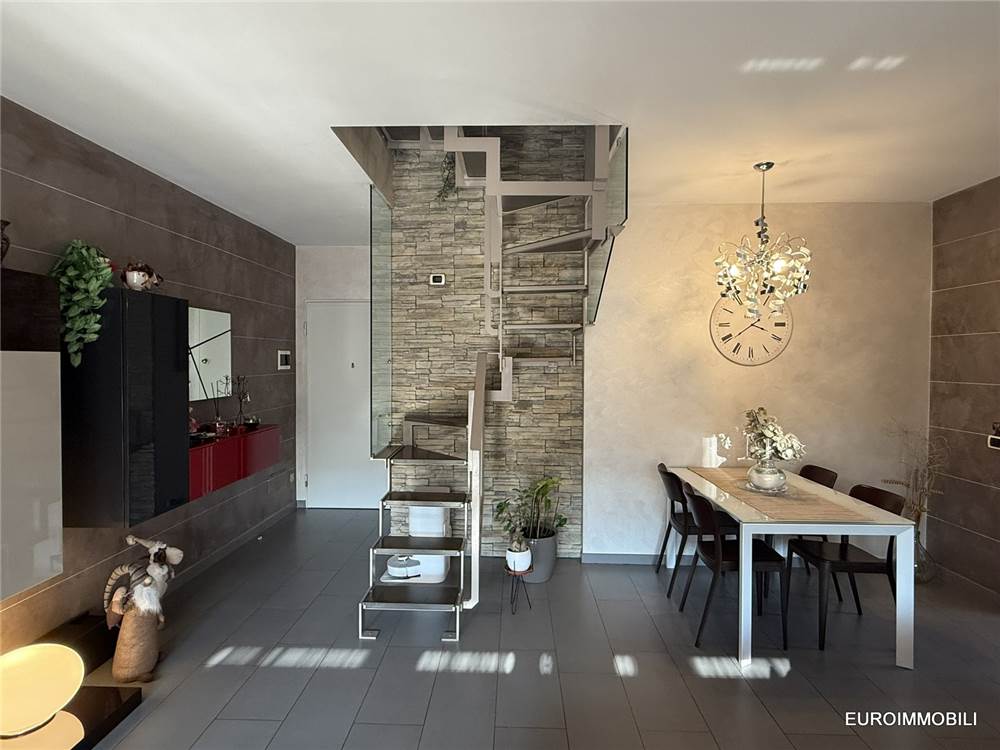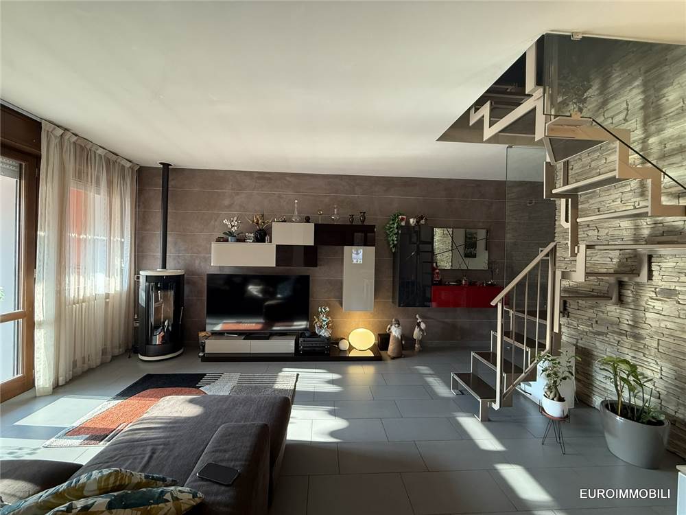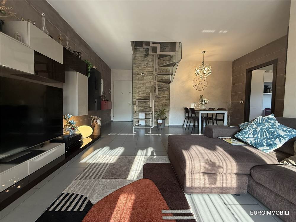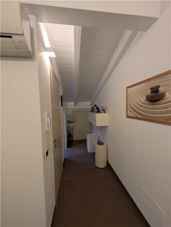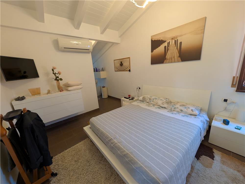 L’unità abitativa si sviluppa su due livelli: al piano primo troviamo un ampio e luminoso soggiorno con loggia dotata di tende da sole, una cucina abitabile, una camera matrimoniale con balcone, disimpegno e bagno. Al piano sottotetto sono presenti una seconda camera matrimoniale, un bagno e un comodo ripostiglio. Il sottotetto è valorizzato dal tetto in legno con travi lamellari a vista, che conferiscono calore e carattere agli ambienti.