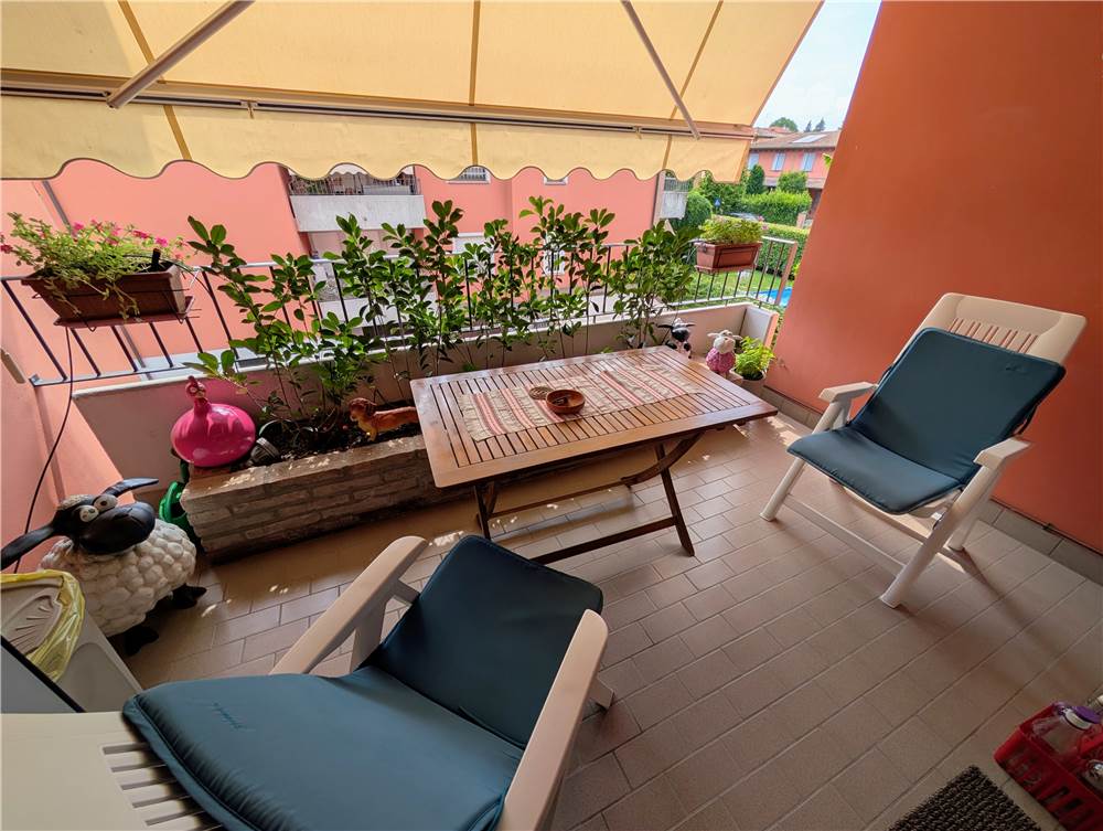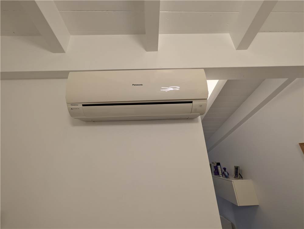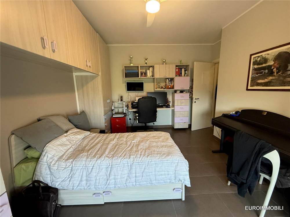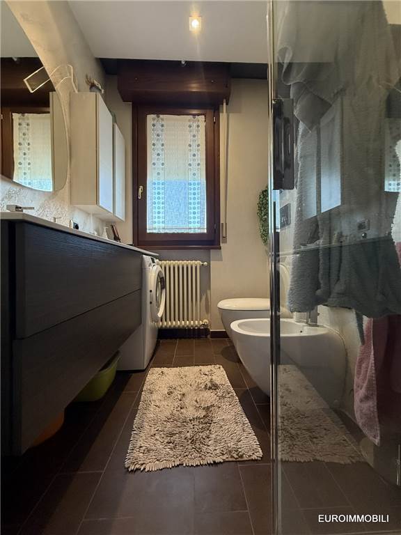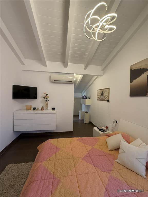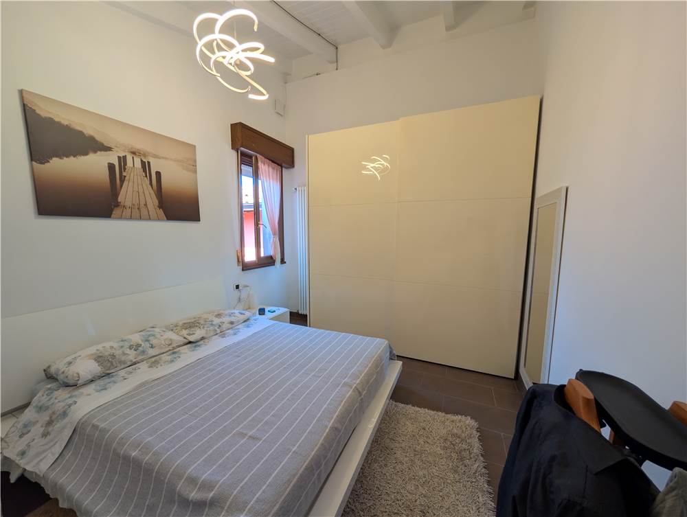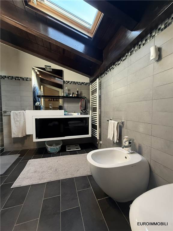 L’unità abitativa si sviluppa su due livelli: al piano primo troviamo un ampio e luminoso soggiorno con loggia dotata di tende da sole, una cucina abitabile, una camera matrimoniale con balcone, disimpegno e bagno. Al piano sottotetto sono presenti una seconda camera matrimoniale, un bagno e un comodo ripostiglio. Il sottotetto è valorizzato dal tetto in legno con travi lamellari a vista, che conferiscono calore e carattere agli ambienti.